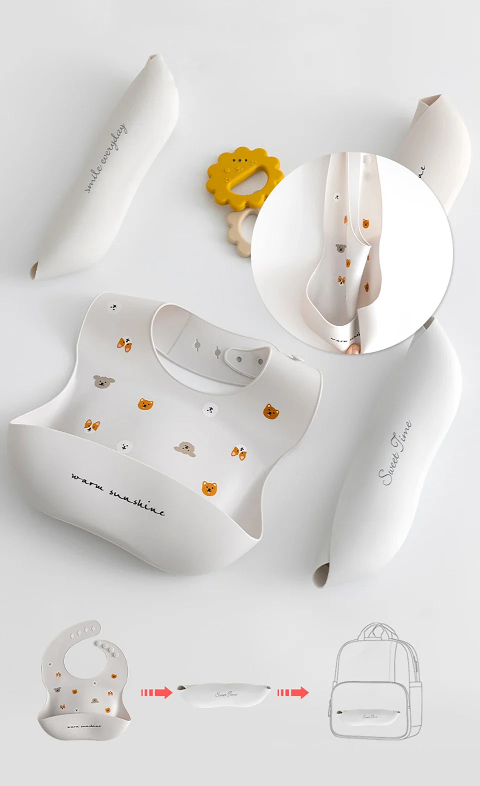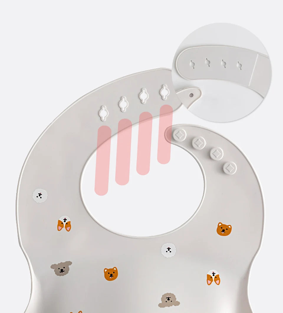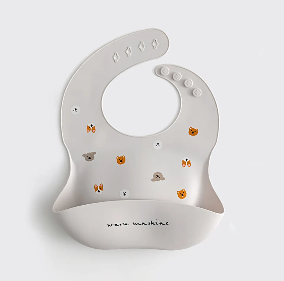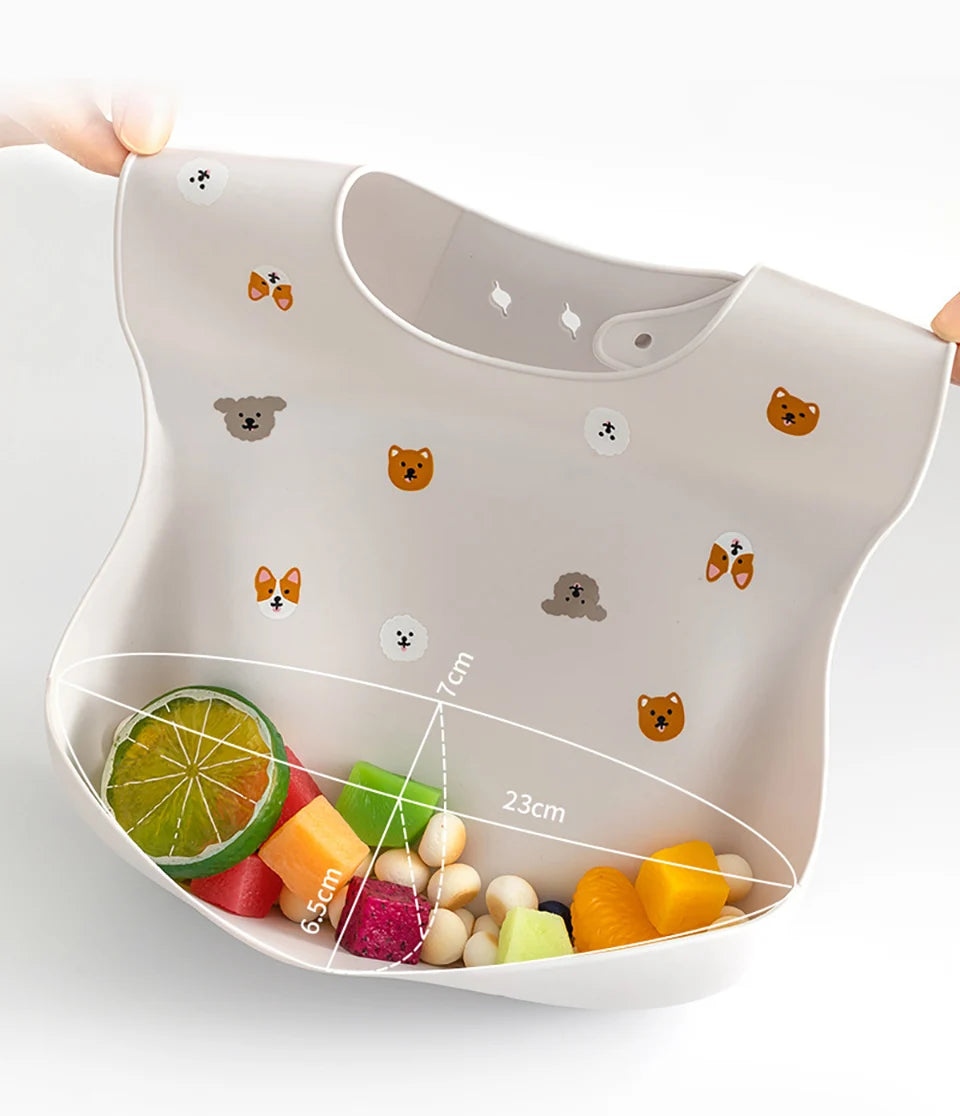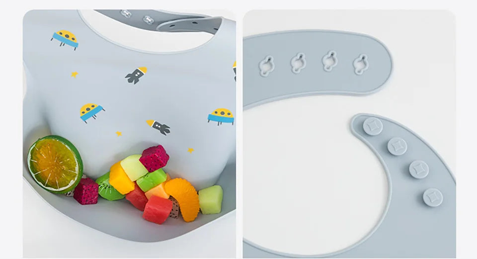 Our silicone bib with a spill-proof pocket is soft, flexible, and easy to clean.